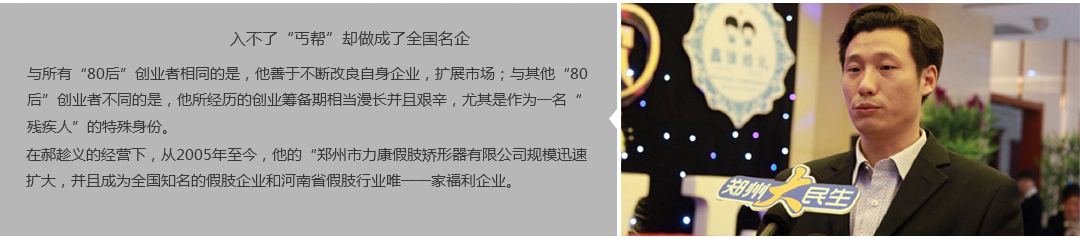 鄭州市力康假肢矯形器有限公司(簡稱力康),是一家專業從事假肢矯形器的設計、研發、制作及裝 配的專業機構。成立于1992年是河南省唯一一家福利企業。力康下設業務部、技術部、住院部、康復 部、售后服務部,并配有現代化的裝配車間和功能齊全的訓練大廳,為殘疾朋友康復訓練提供了可靠 保障??偨浝泶┐骷僦嗄?,有著豐富的臨床經驗和親身體會;多年來,力康已為全國幾十萬名殘疾 朋友安裝上舒適、美觀、耐用的假肢和矯形器具,使他們更大限度地恢復了正常的工作和生活?!爱a 品即人品”的質量理念、先進的技術、實惠的價格、完善的售后服務是力康取勝的法寶……